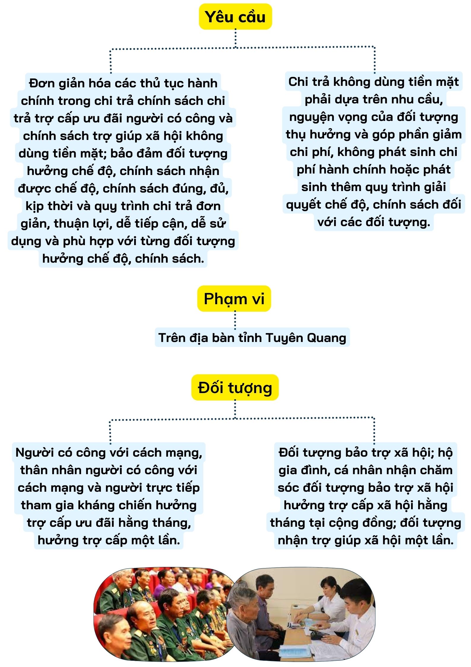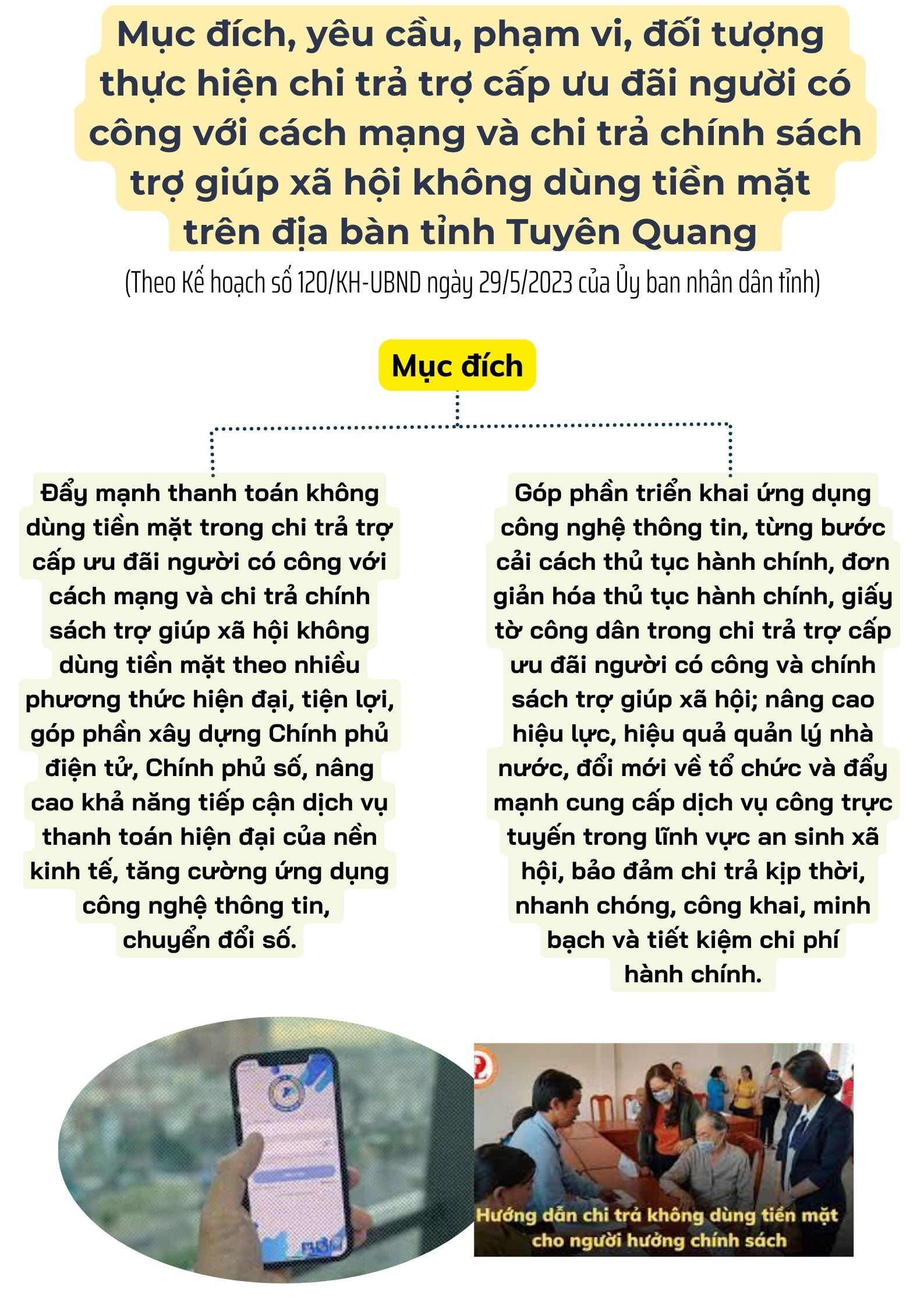 Ngày 29/5/2023, Ủy ban nhân dân tỉnh đã ban hành Kế hoạch số 120/KH-UBND triển khai thực hiện chi trả trợ cấp ưu đãi người có công với cách mạng và chi trả chính sách trợ giúp xã hội không dùng tiền mặt trên địa bàn tỉnh Tuyên Quang với mục đích, yêu cầu, phạm vi và đối tượng như sau: