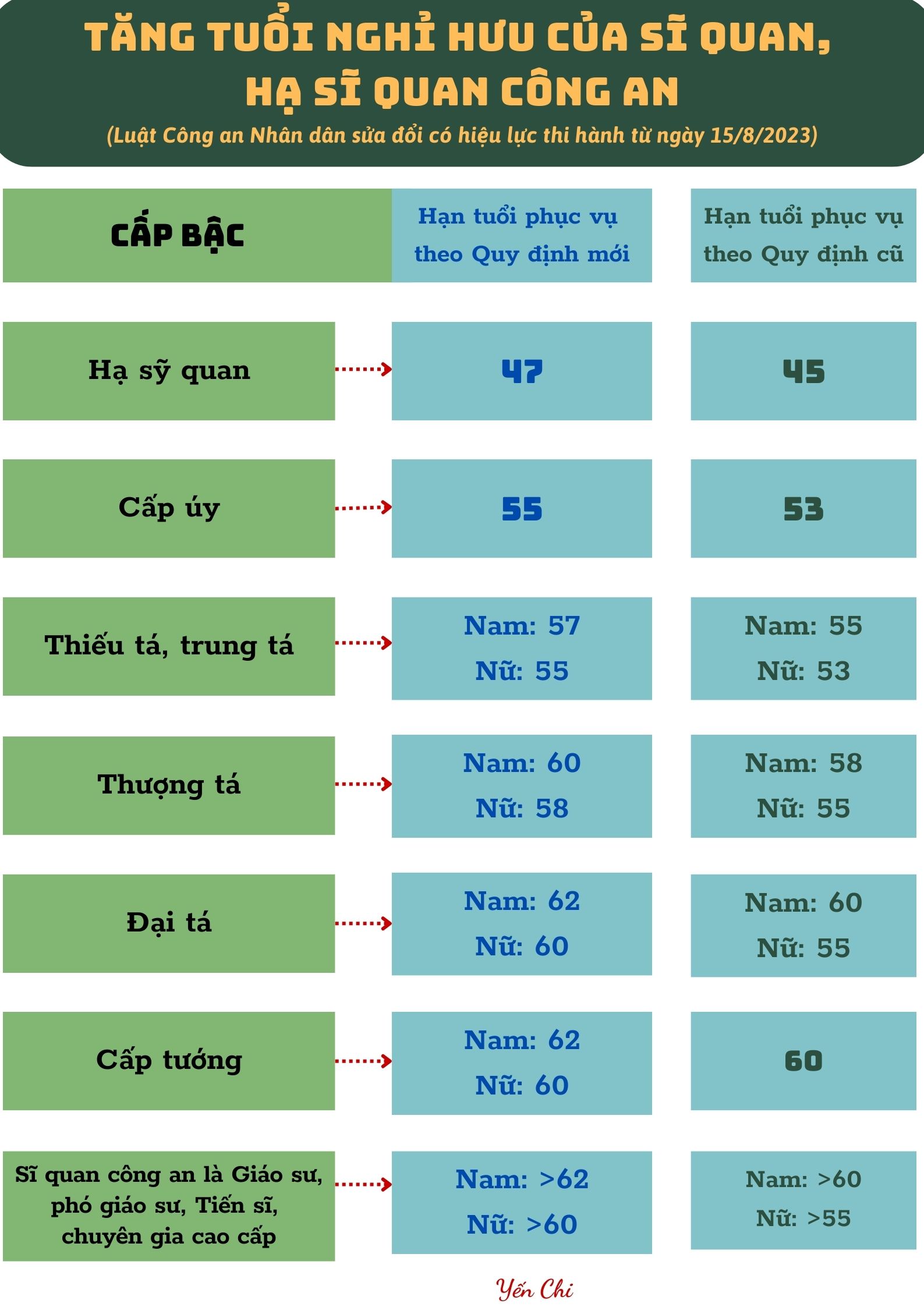 Ngày 22/6/2023, Quốc hội ban hành Luật Sửa đổi, bổ sung một số điều của Luật Công an nhân dân 2023 (Luật Công an nhân dân sửa đổi 2023), có hiệu lực từ ngày 15/8/2023, trong đó quy định tăng tuổi nghỉ hưu của sĩ quan, hạ sĩ quan Công an, cụ thể: