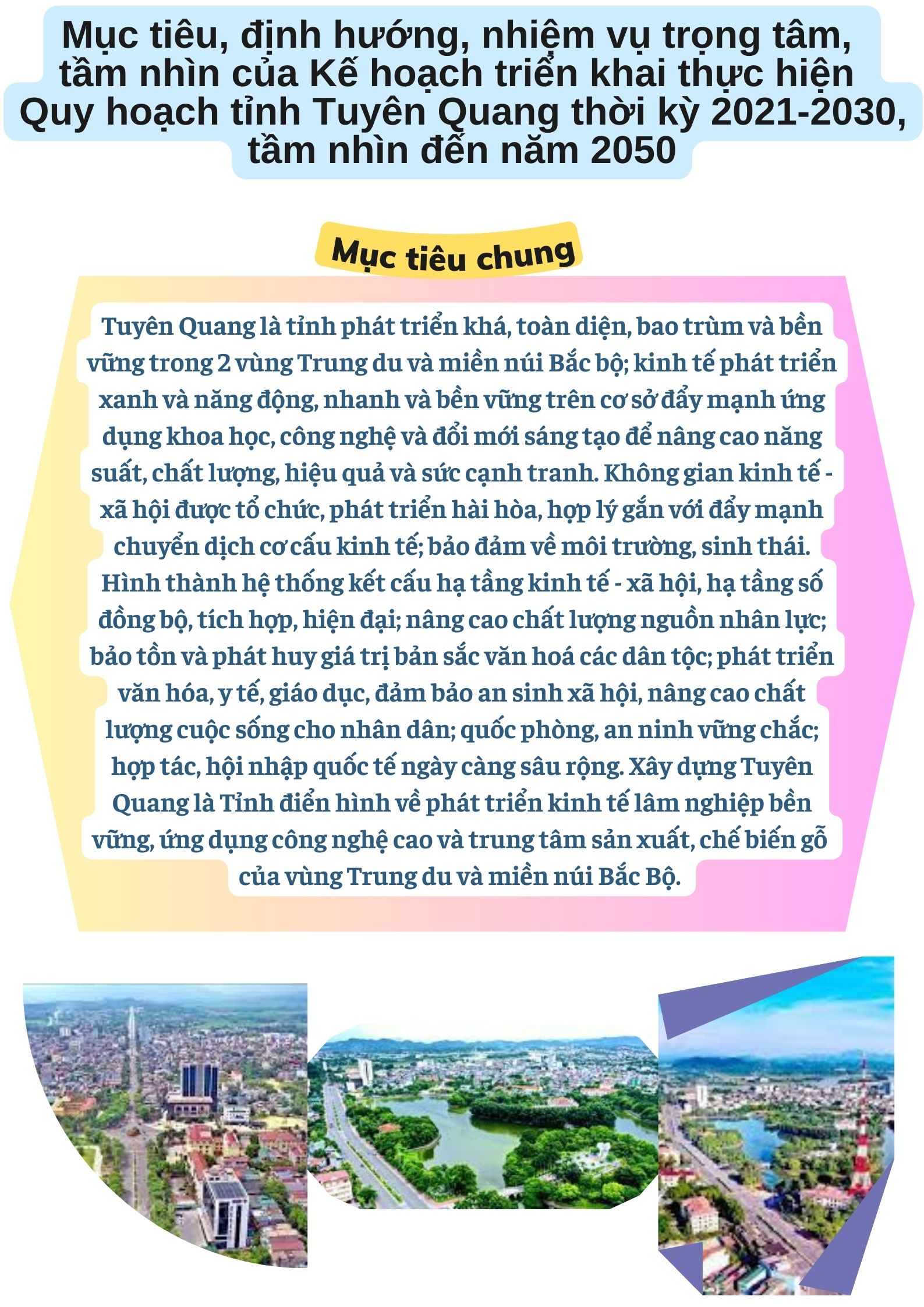 Ngày 19/9/2023, Ủy ban nhân dân tỉnh đã ban hành Kế hoạch số 220-KH/UBND triển khai thực hiện Quy hoạch tỉnh Tuyên Quang thời kỳ 2021-2030, tầm nhìn đến năm 2050 với mục tiêu, định hướng, nhiệm vụ trọng tâm, tầm nhìn như sau: