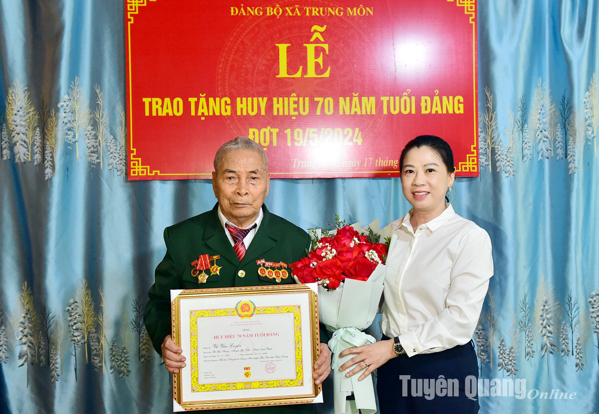 Đồng chí Phó Bí thư Thường trực Tỉnh ủy, Chủ tịch HĐND tỉnh Lê Thị Kim Dung đã trao Huy hiệu 75 năm tuổi Đảng cho đồng chí Hà Thị Trang, Chi bộ thôn Yên Lộc, Đảng bộ xã Hoàng Khai; Huy hiệu 70 năm tuổi Đảng cho đồng chí Vũ Văn Luyện, Chi bộ 6, Đảng bộ xã Trung Môn, huyện Yên Sơn.