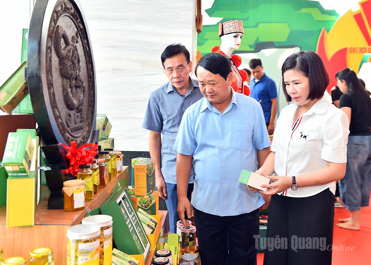 Đồng chí Bí thư Tỉnh ủy Hầu A Lềnh kiểm tra gian trưng bày giới thiệu sản phẩm của tỉnh tại khu vực sảnh hội trường.
