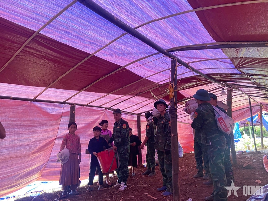Cùng với đó, đơn vị nhanh chóng cơ động một bộ phận đến thôn Mã Lầu A, khu vực có nguy cơ sạt lở cao giúp dân chằng buộc, gia cố các công trình dân sinh.