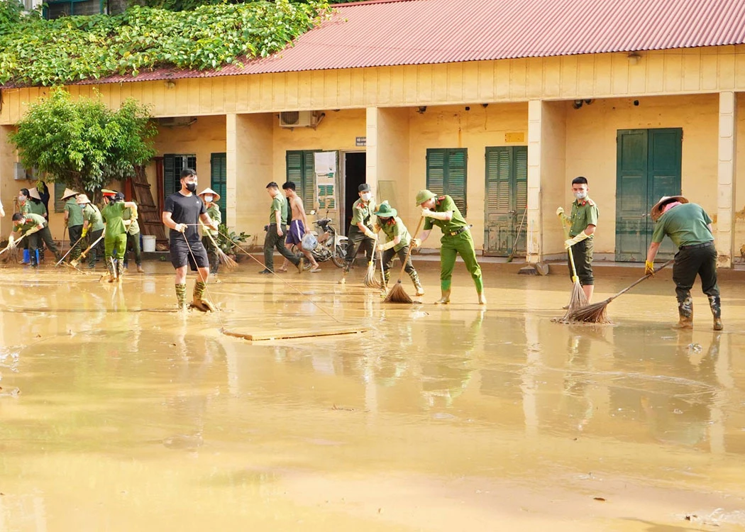 Công an tỉnh Thái Nguyên hỗ trợ cùng nhân dân dọn dẹp, vệ sinh môi trường sau mưa lũ, ngập lụt. |