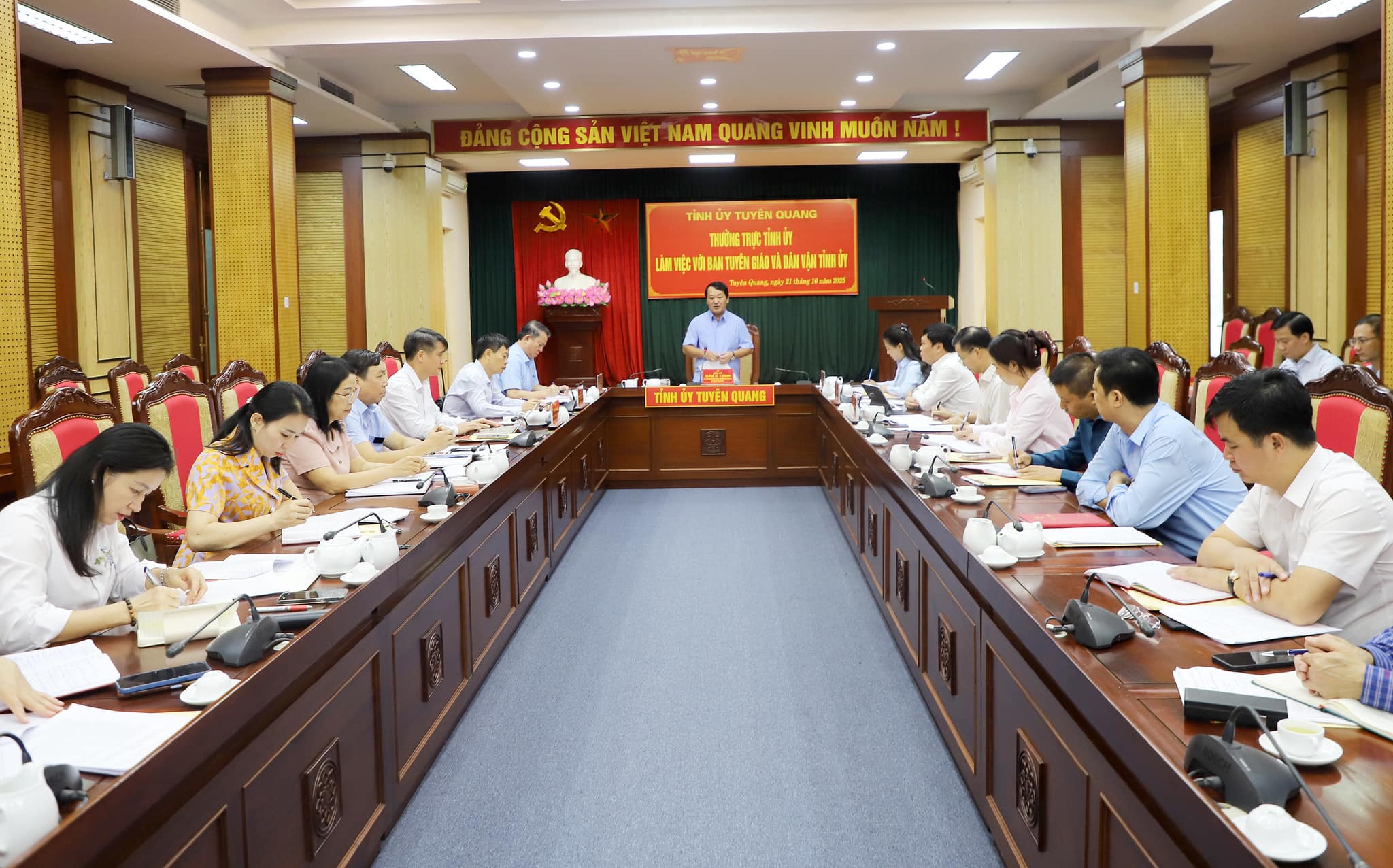Trước yêu cầu nhiệm vụ trong tình hình mới, quán triệt quan điểm chỉ đạo của đồng chí Nguyễn Trọng Nghĩa, Uỷ viên Trung ương Đảng, Trưởng Ban Tuyên giáo và Dân Vận Trung ương: Công tác tuyên giáo, dân vận trong giai đoạn mới phải là người tiên phong định hướng tư tưởng, dẫn dắt nhận thức, truyền tải khát vọng phát triển của dân tộc, xung kích, sáng tạo… Ban Tuyên giáo và Dân vận Tỉnh uỷ Tuyên Quang đã và đang tích cực đổi mới, sáng tạo trong thực hiện công tác chuyên môn, nghiệp vụ, sẵn sàng thực hiện và hoàn thành tốt vai trò, nhiệm vụ của cơ quan trực tiếp tham mưu, giúp việc cấp uỷ tỉnh về công tác tư tưởng.