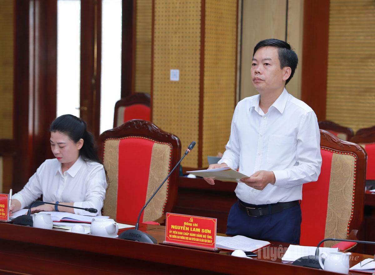 Phó Trưởng ban Thường trực Ban Tuyên giáo và Dân vận Tỉnh uỷ Nguyễn Lam Sơn báo cáo tình hình thực hiện Nghị quyết số 57 và Kết luận số 81 của tỉnh. |