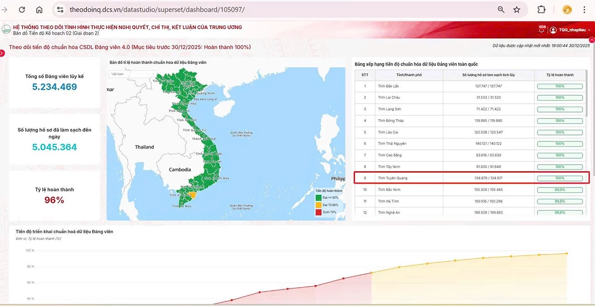 Theo Hệ thống theo dõi tình hình thực hiện nghị quyết, chỉ thị, kết luận của Trung ương, đến ngày 31-12-2025, tỉnh Tuyên Quang đã hoàn thành 100% việc chuẩn hóa cơ sở dữ liệu đảng viên, xếp thứ 9/34 tỉnh, thành phố trong cả nước, đúng tiến độ theo yêu cầu đề ra.