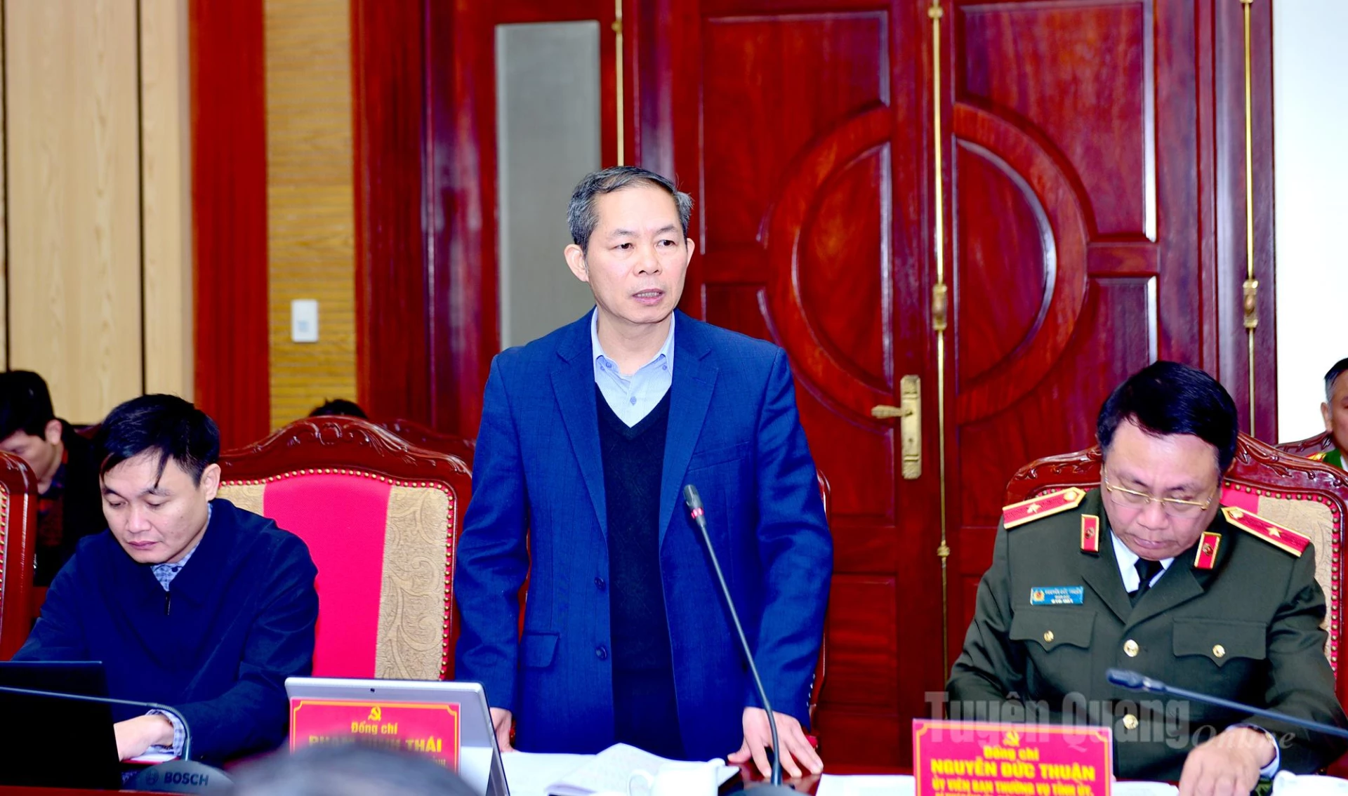 | Thiếu tướng Nguyễn Đức Thuận, Giám đốc Công an tỉnh phát biểu thảo luận tại hội nghị. |