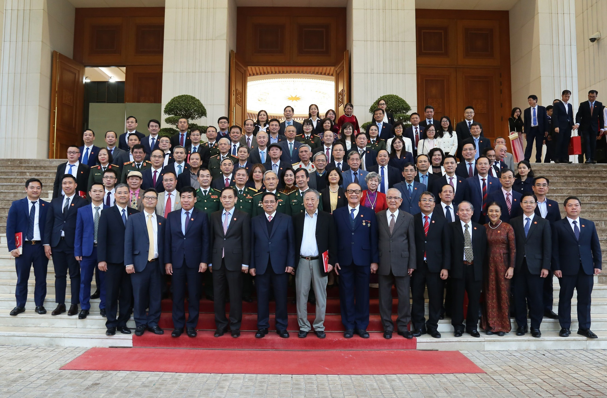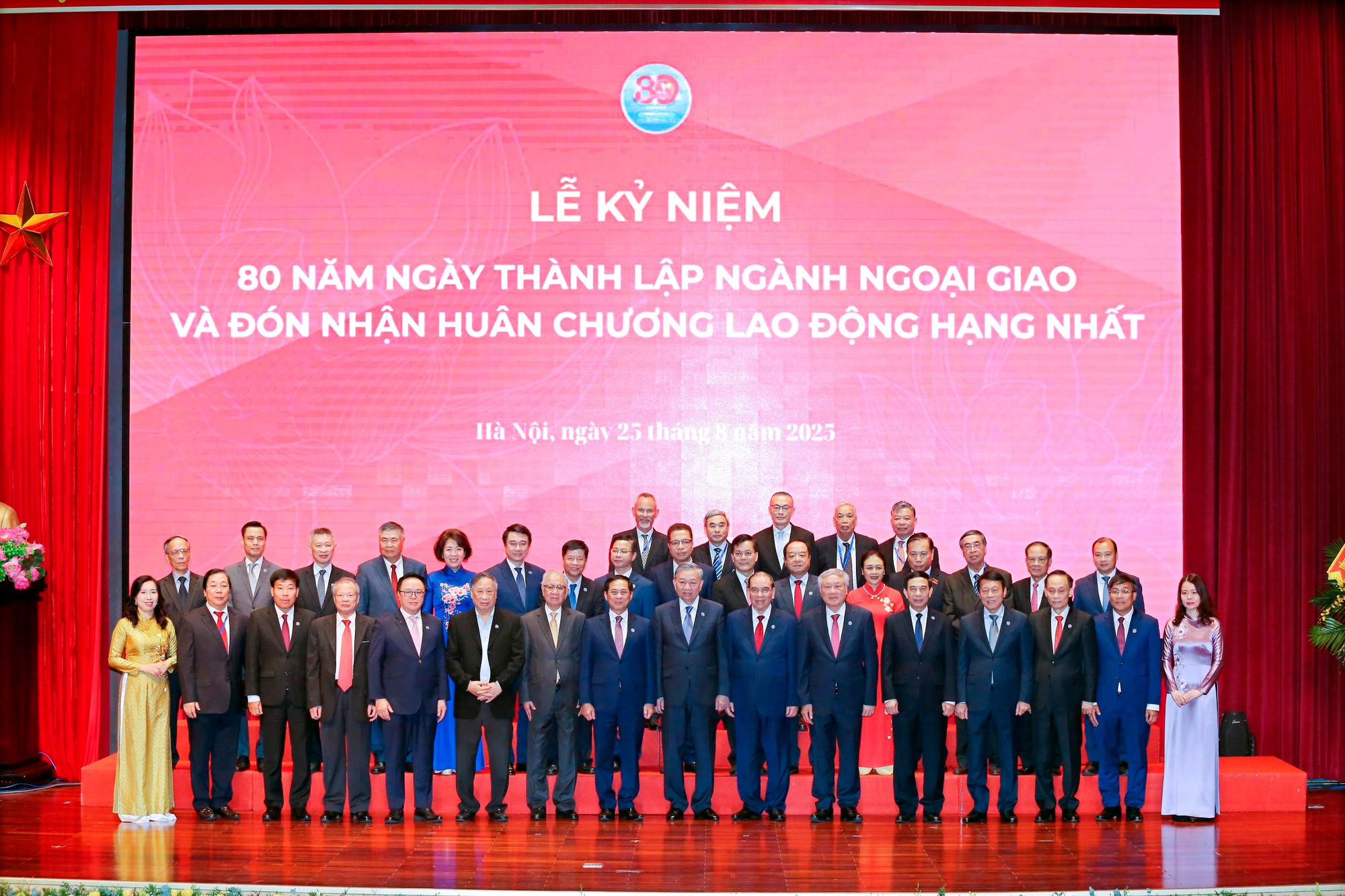 Thủ tướng Chính phủ Phạm Minh Chính chụp ảnh chung cùng các đại biểu tham dự buổi Lễ trao tặng Huân chương Lao động hạng Nhất cho Ủy ban Biên giới quốc gia, Bộ Ngoại giao nhân Lễ kỷ niệm 50 năm thành lập (1975 - 2025), ngày 15/12/2025. Nguồn: Bộ Ngoại giao.