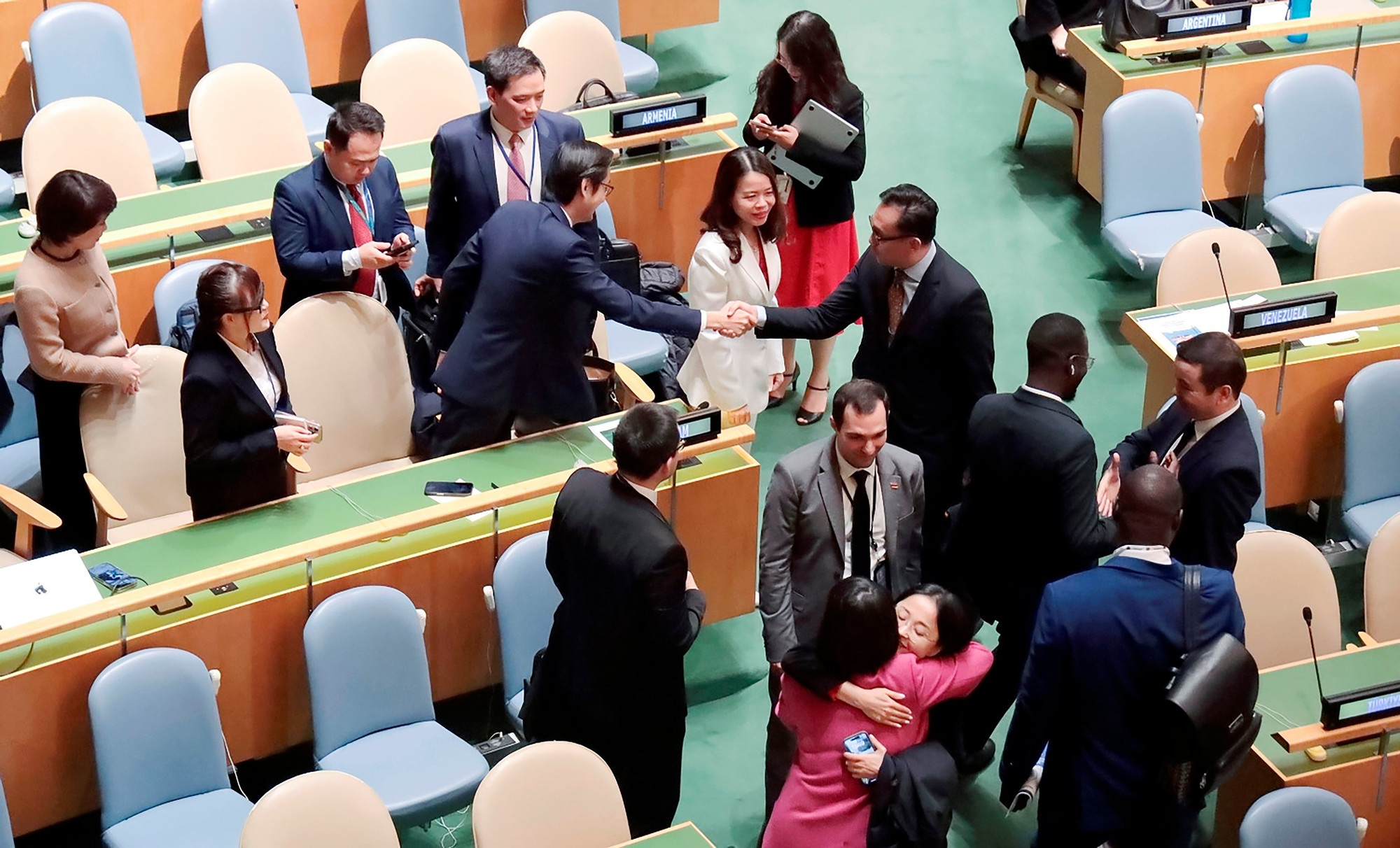 Ngày 14/10/2025, tại trụ sở Liên hợp quốc, bạn bè quốc tế chúc mừng Việt Nam tái đắc cử Hội đồng nhân quyền Liên hợp quôc với số phiếu ủng hộ là 180, cao nhất trong số các ứng cử viên đại diện cho khu vực châu Á-Thái Bình Dương. Nguồn: Bộ Ngoại giao.