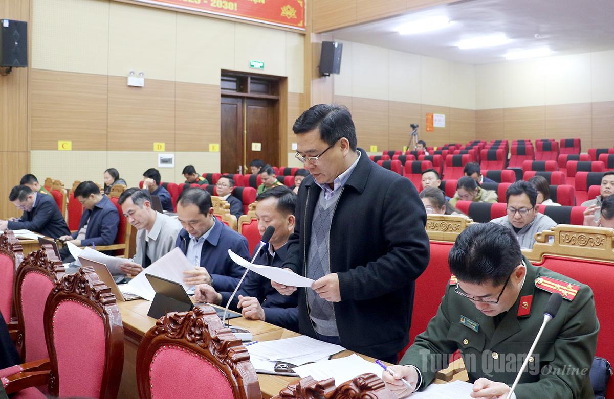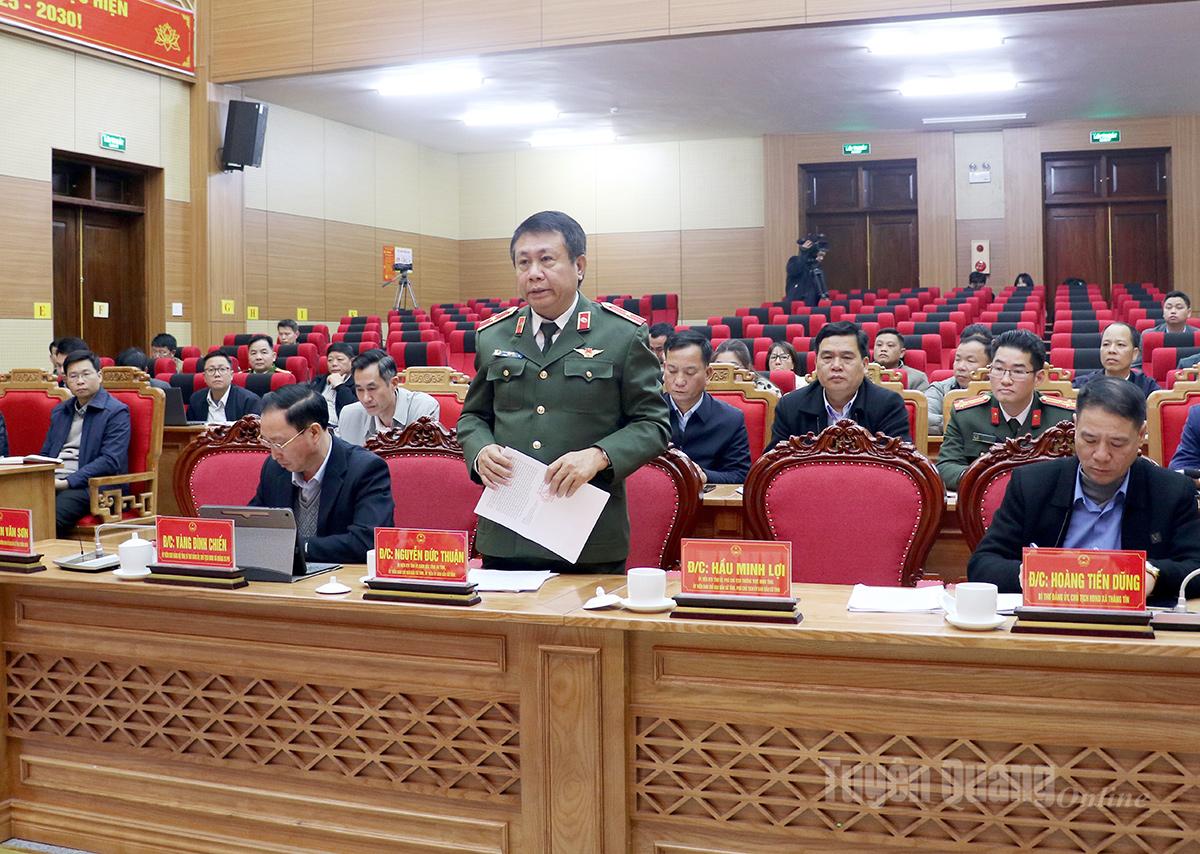 Thiếu tướng Nguyễn Đức Thuận, Ủy viên Ban Thường vụ Tỉnh ủy, Giám đốc Công an tỉnh, Ủy viên Ban Chỉ đạo bầu cử, Ủy viên Ủy ban bầu cử tỉnh phát biểu tại buổi làm việc. |
