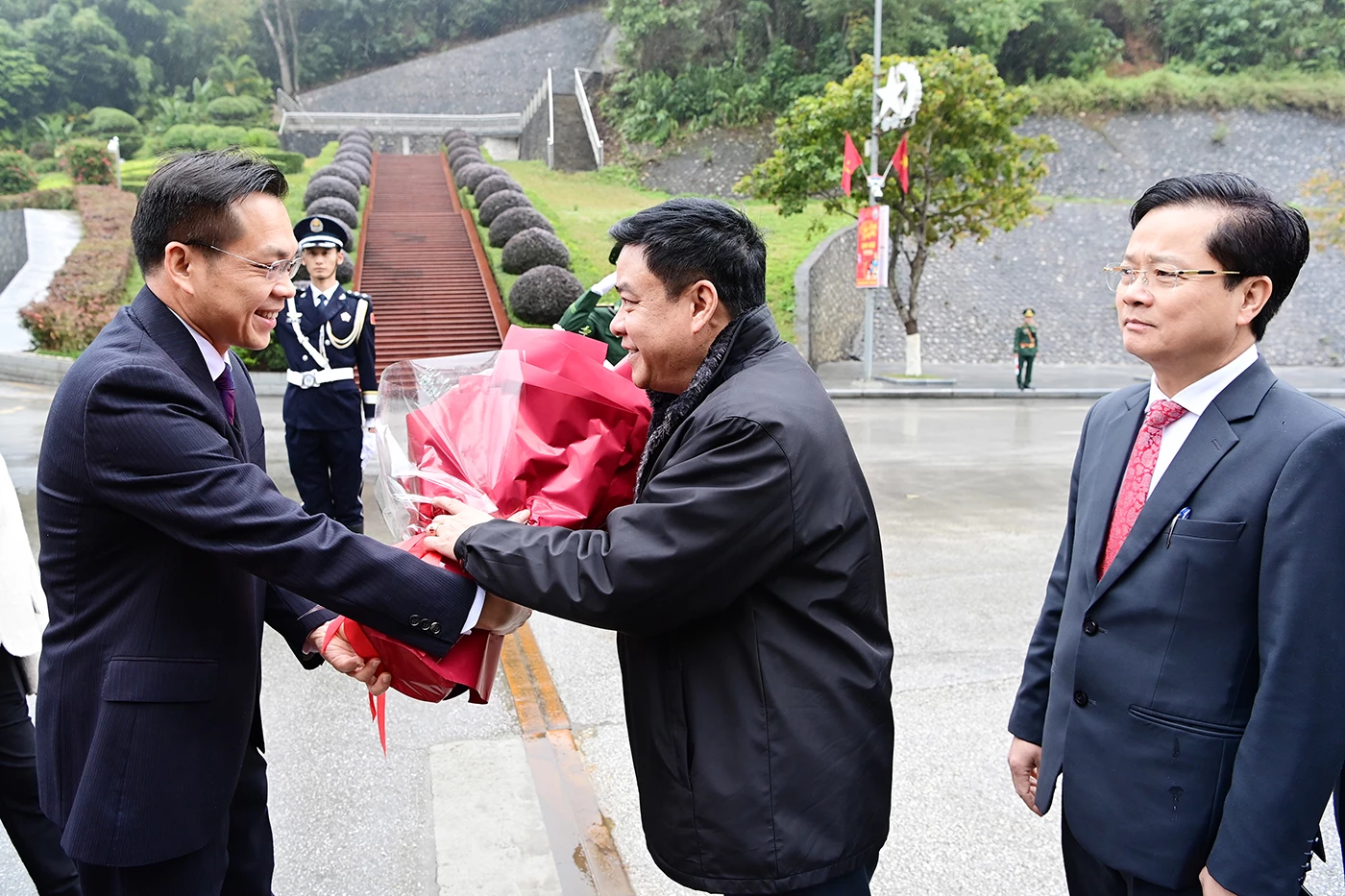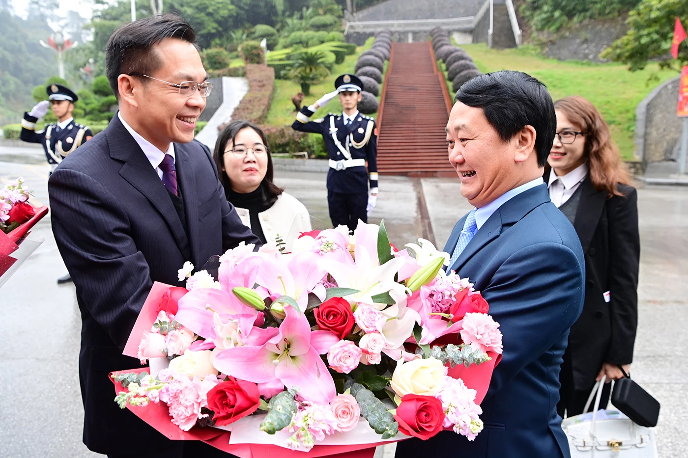 Đồng chí Bàng Xuân Triều, Phó Thị trưởng Chính quyền nhân dân thành phố Bách Sắc tặng hoa đón đồng chí Hầu A Lềnh, Ủy viên BCH Trung ương Đảng, Bí thư Tỉnh ủy và đoàn công tác tỉnh Tuyên Quang. |