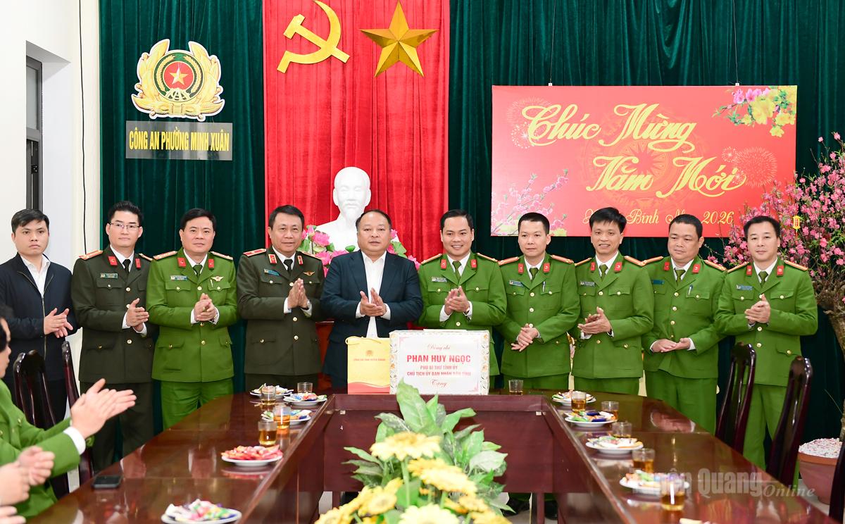 Tại Công an phường Minh Xuân, Chủ tịch UBND tỉnh Phan Huy Ngọc biểu dương sự chủ động, triển khai các phương án đảm bảo an ninh trật tự, an toàn xã hội trước, trong và sau Tết Nguyên đán trên địa bàn phường. Đồng chí nhấn mạnh, phường Minh Xuân là phường trung tâm đầu não của tỉnh, giữ vị trí đặc biệt quan trọng về chính trị, kinh tế - xã hội, quốc phòng, an ninh, vì vậy lực lượng Công an phường cần tiếp tục nắm chắc tình hình, tăng cường phối hợp với các đơn vị đảm bảo an ninh trật tự, an toàn giao thông tại các điểm tổ chức các hoạt động lễ hội mừng Xuân. Nêu cao tinh thần cảnh giác, phát hiện, xử lý kịp thời các vụ việc, không để bị động bất ngờ trong mọi tình huống; bảo đảm an ninh, an toàn cho Nhân dân đón Tết, vui Xuân bình yên.