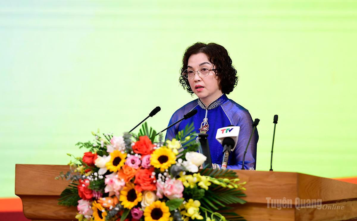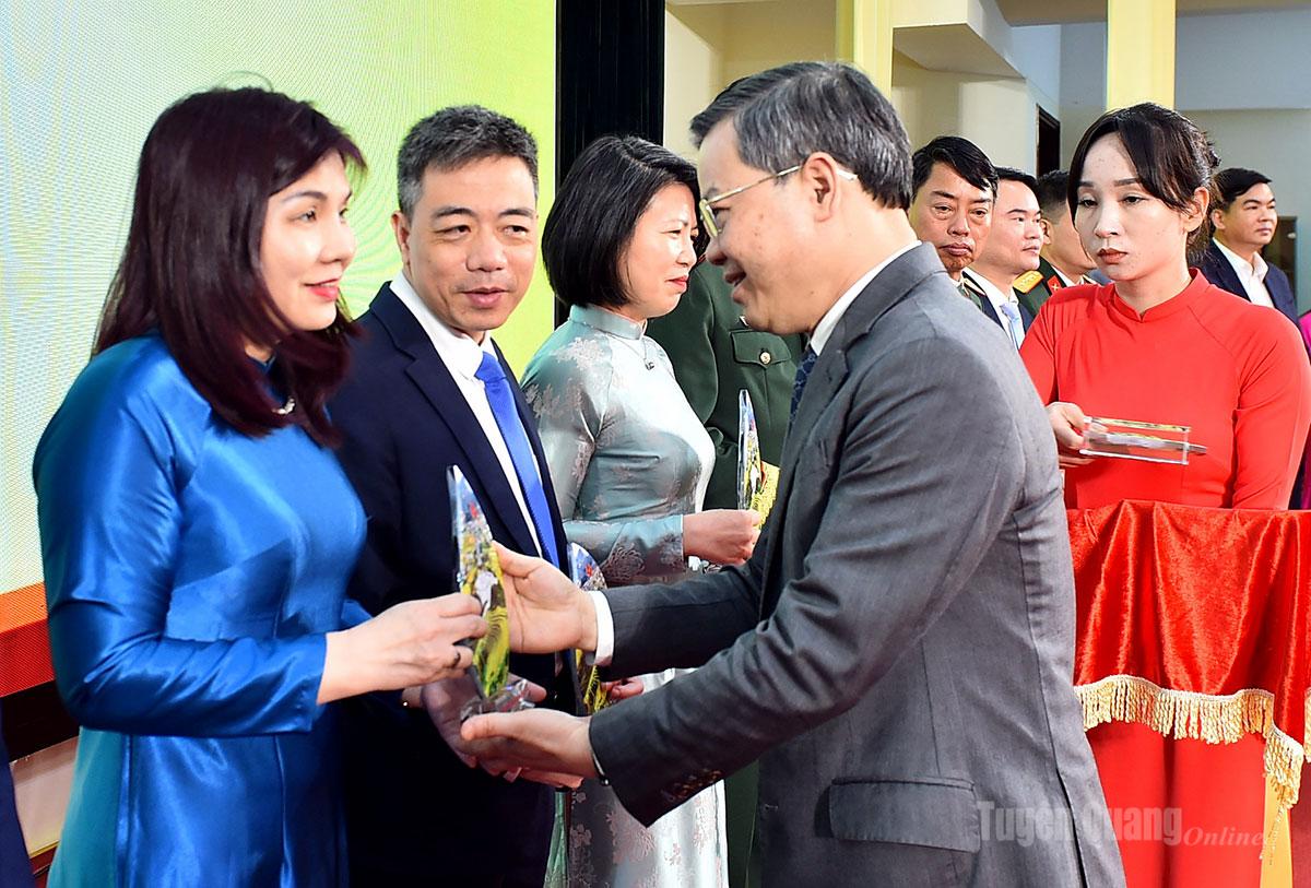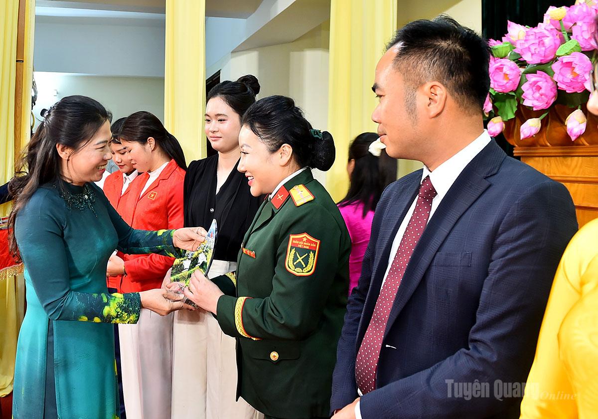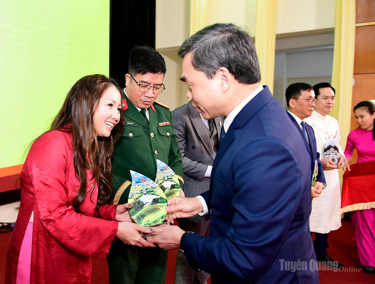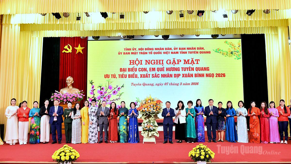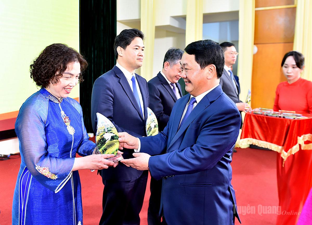 Nhân dịp này, Tỉnh ủy, HĐND, UBND, Ủy ban MTTQ Việt Nam tỉnh Tuyên Quang tặng quà lưu niệm cho con, em quê hương Tuyên Quang ưu tú tiêu biểu, xuất sắc và có lẵng hoa tươi thắm chúc mừng các đại biểu nữ có mặt tại Hội nghị nhân dịp kỷ niệm 116 năm ngày Quốc tế phụ nữ (8/3/1910-8/3/2026) và 1986 năm cuộc Khởi nghĩa Hai Bà Trưng.