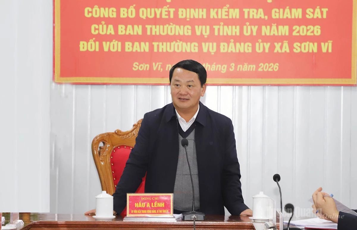 Chiều 10-3, tại xã Sơn Vĩ đã diễn ra Hội nghị công bố quyết định kiểm tra, giám sát năm 2026 của Ban Thường vụ Tỉnh ủy đối với Ban Thường vụ Đảng ủy xã Sơn Vĩ. Dự hội nghị có đồng chí Hầu A Lềnh, Ủy viên Ban Chấp hành Trung ương Đảng, Bí thư Tỉnh ủy.