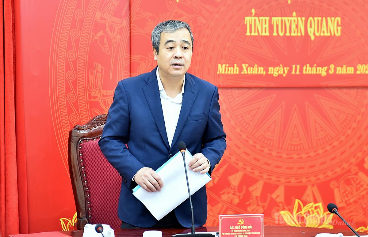 | Đồng chí Phó Trưởng ban Tuyên giáo và Dân vận Trung ương Ngô Đông Hải phát biểu tại buổi làm việc. |