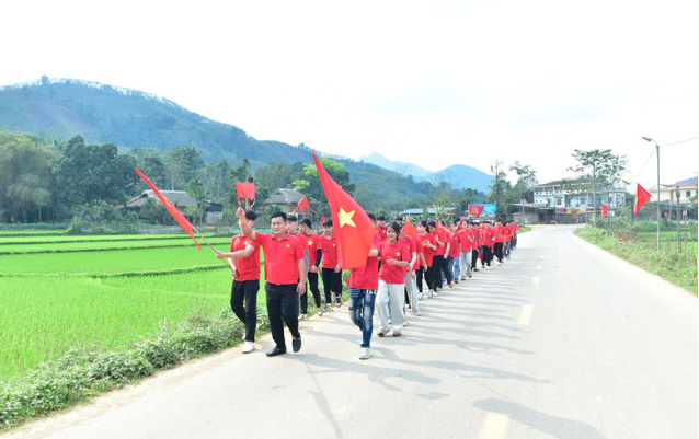 Thầy cô giáo và các em học sinh Trường THCS Tiên Yên, xã Tiên Yên, tỉnh Tuyên Quang diễu hành, cổ động tuyên truyền bầu cử.