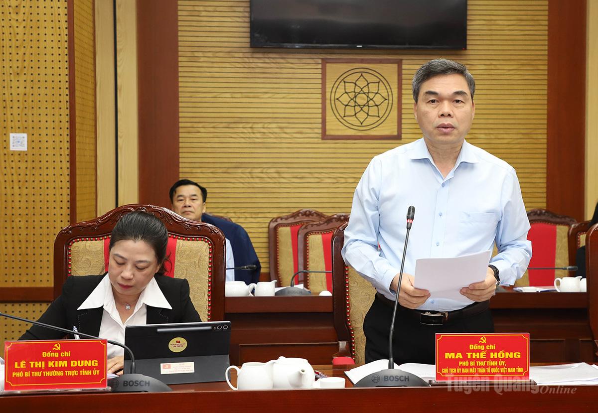 Phó Bí thư Tỉnh ủy, Chủ tịch Ủy ban MTTQ tỉnh Ma Thế Hồng trình bày kết quả công tác lãnh đạo, chỉ đạo thực hiện nhiệm vụ quý I/2026. |