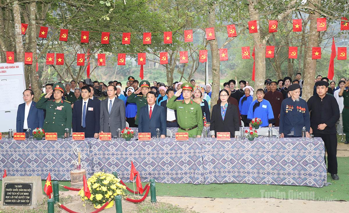 Bí thư Tỉnh ủy Hầu A Lềnh và các đại biểu dâng hương, hoa tại Đình Tân Trào trước giờ khai mạc cuộc bầu cử. |