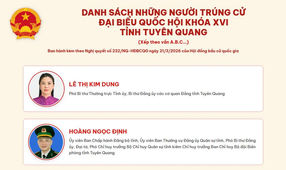 Ban Biên tập Cổng thông tin điện tử Đảng bộ tỉnh trân trọng giới thiệu danh sách những người trúng cử đại biểu Quốc hội khoá XVI tỉnh Tuyên Quang