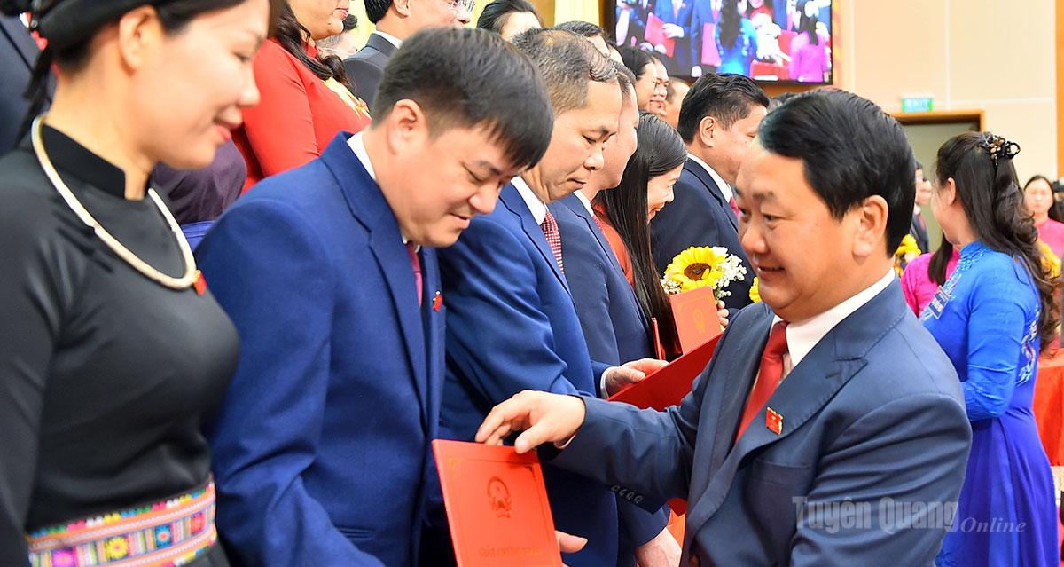 | Đồng chí Bí thư Tỉnh ủy Hầu A Lềnh trao Chứng nhận đại biểu HĐND tỉnh cho các đại biểu. |
