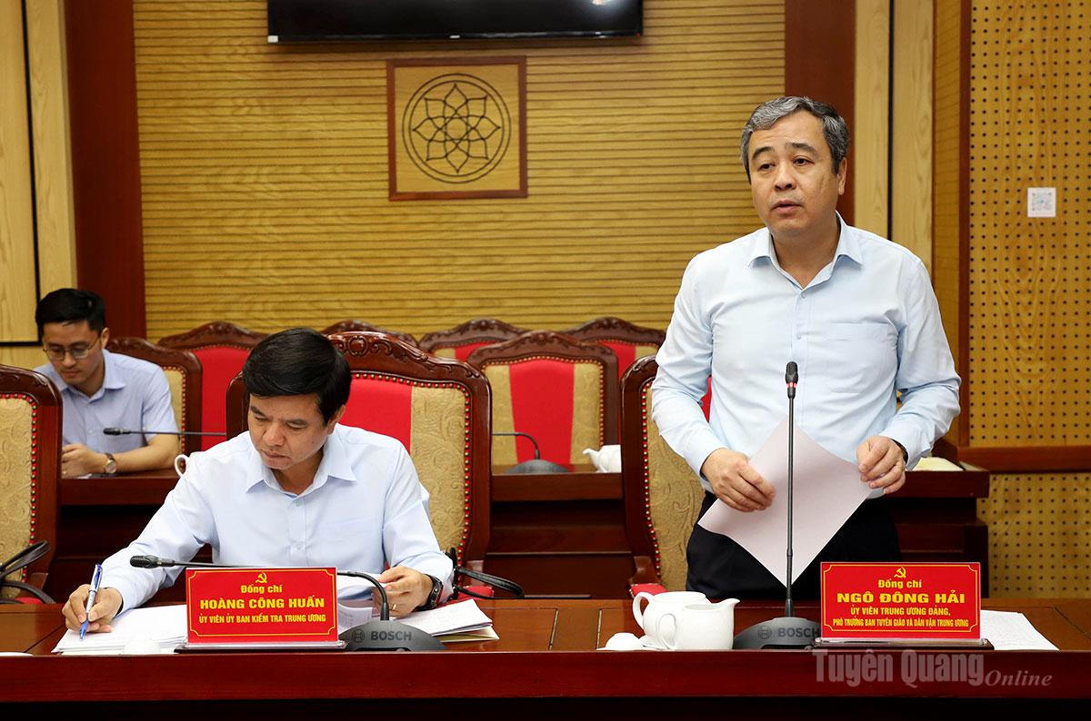 Đồng chí Ngô Đông Hải, Ủy viên Trung ương Đảng, Phó Trưởng ban Tuyên giáo và Dân vận Trung ương thông báo kết quả giám sát đợt 1 đối với Ban Thường vụ Tỉnh ủy Tuyên Quang. |