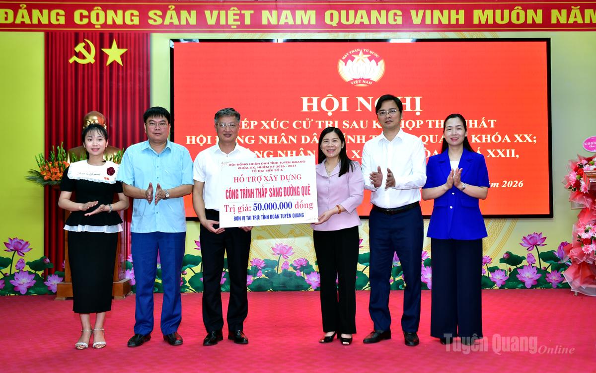 Nhân dịp này, Tổ đại biểu số 6 HĐND tỉnh đã trao tặng 50 triệu đồng hỗ trợ xã Thái Hoà xây dựng công trình thắp sáng đường quê; tặng quà 3 em học sinh có hoàn cảnh khó khăn trên địa bàn xã.
