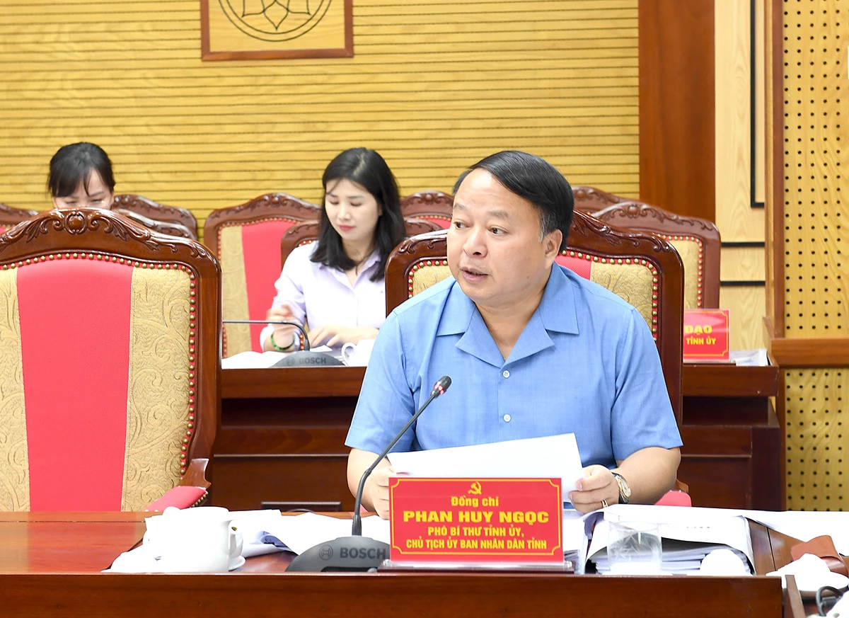| Đồng chí Phó Bí thư Tỉnh ủy, Chủ tịch UBND tỉnh Phan Huy Ngọc phát biểu tại cuộc họp. |