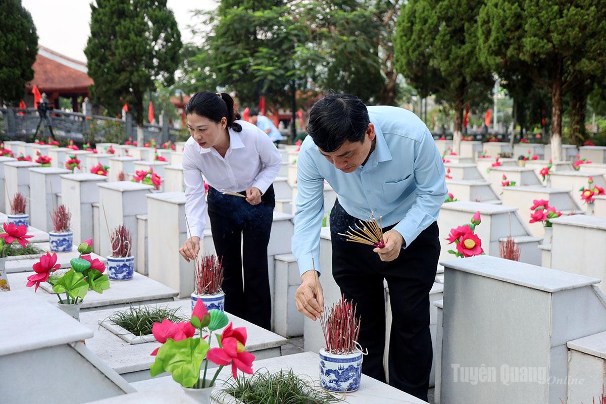 | Các đại biểu thắp hương phần mộ Liệt sĩ tại Nghĩa trang Liệt sĩ Quốc gia Vị Xuyên. |