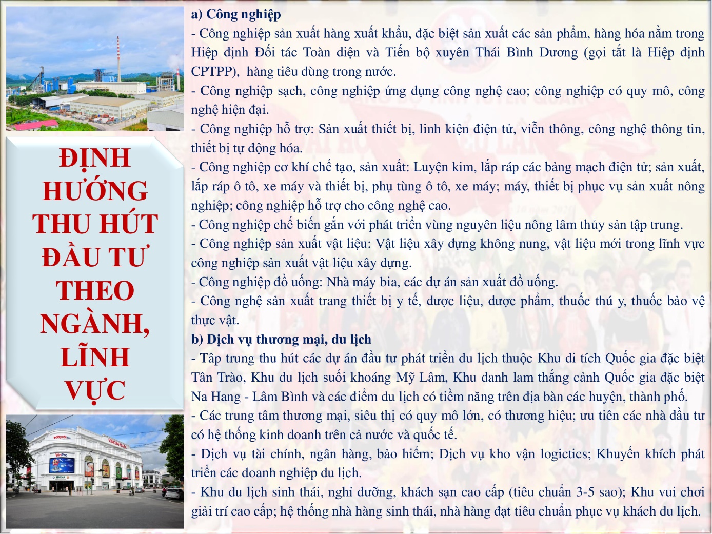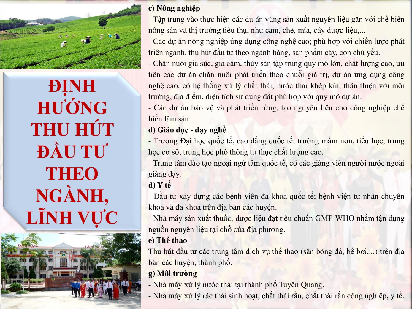 Nguồn tư liệu: Quyết định số 336/QĐ-UBND ngày 02/6/2021 của Ủy ban nhân dân tỉnh ban hành Đề án Thu hút đầu tư trên địa bàn tỉnh Tuyên Quang giai đoạn 2021-2025.