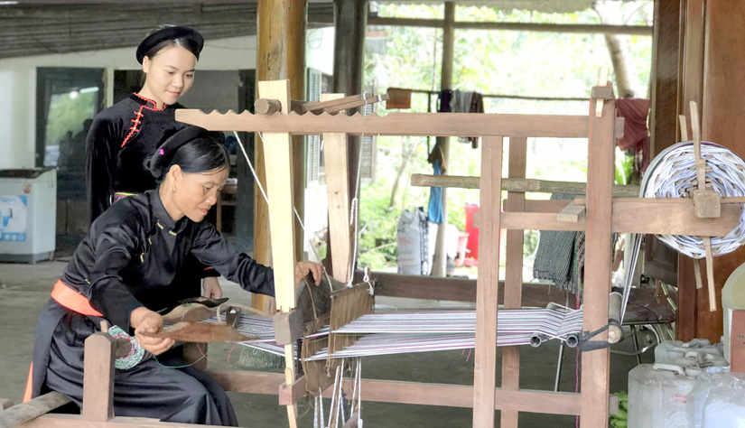 Bà Chẩu Thị Hành, thôn Nặm Đíp, thị trấn Lăng Can (Lâm Bình) truyền nghề dệt thổ cẩm truyền thống cho người trẻ.