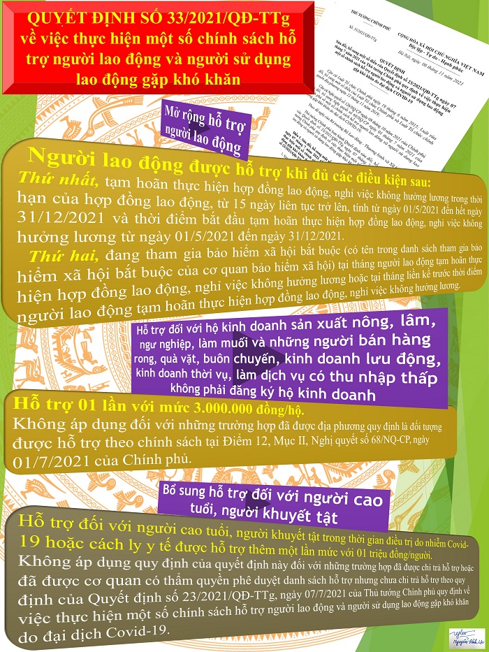 Ngày 06/11/2021, Thủ tướng Chính phủ đã ban hành Quyết định 33/2021/QĐ-TTg sửa đổi, bổ sung một số điều của Quyết định số 23/2021/QĐ-TTg, ngày 07/7/2021 của Thủ tướng Chính phủ quy định về việc thực hiện một số chính sách hỗ trợ người lao động và người sử dụng lao động gặp khó khăn. Quyết định có hiệu lực từ ngày 06/11/2021.